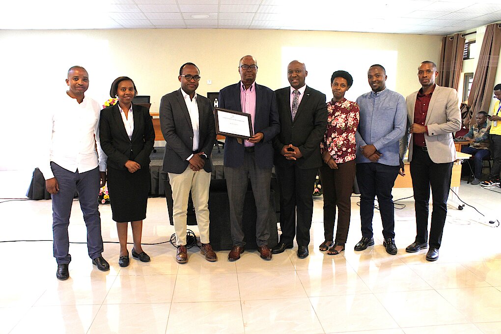 Umukozi ugiye mu kiruhuko cy’izabukuru GATERA Augustin ashyikirizwa igihembo na Nyakubahwa Umunyamabanga wa Leta.
