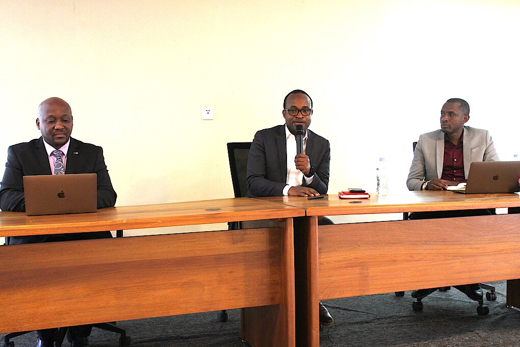 Nyakubahwa Umunyamabanga wa Leta, Gaspard TWAGIRAYEZU (Hagati), Umuyobozi Mukuru wa REB, Dr. MBARUSHIMANA Nelson (ibumoso), Umuyobozi ushinzwe imirimo rusange muri REB, NKURIKIYINKA Janvier ( iburyo)